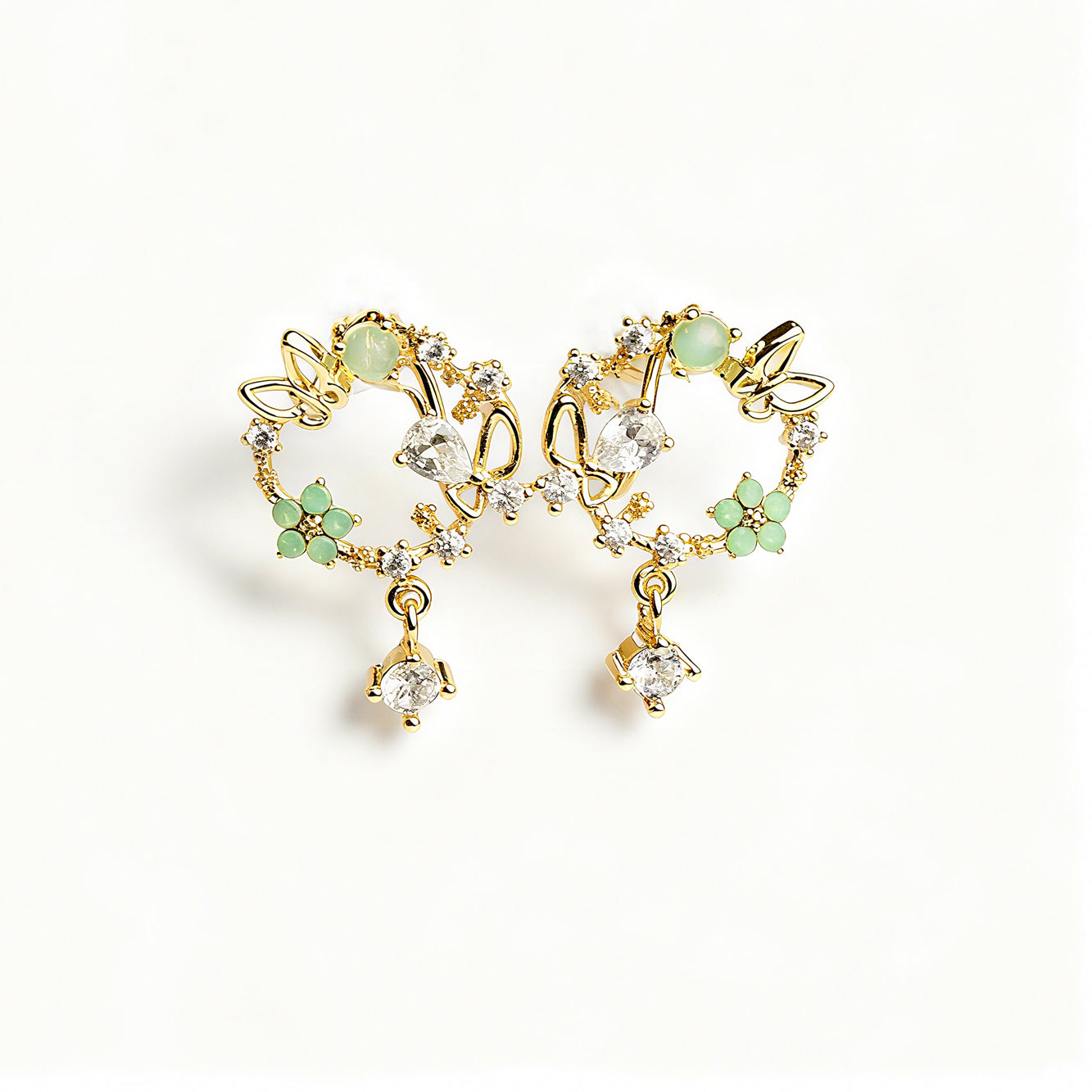 Green Crystal Clip On Earring Diamond Open Circle Dangle Earring Floral Butterfly Wreath Stud Earrings Non Pierced Wreath Clip-on Earrings
