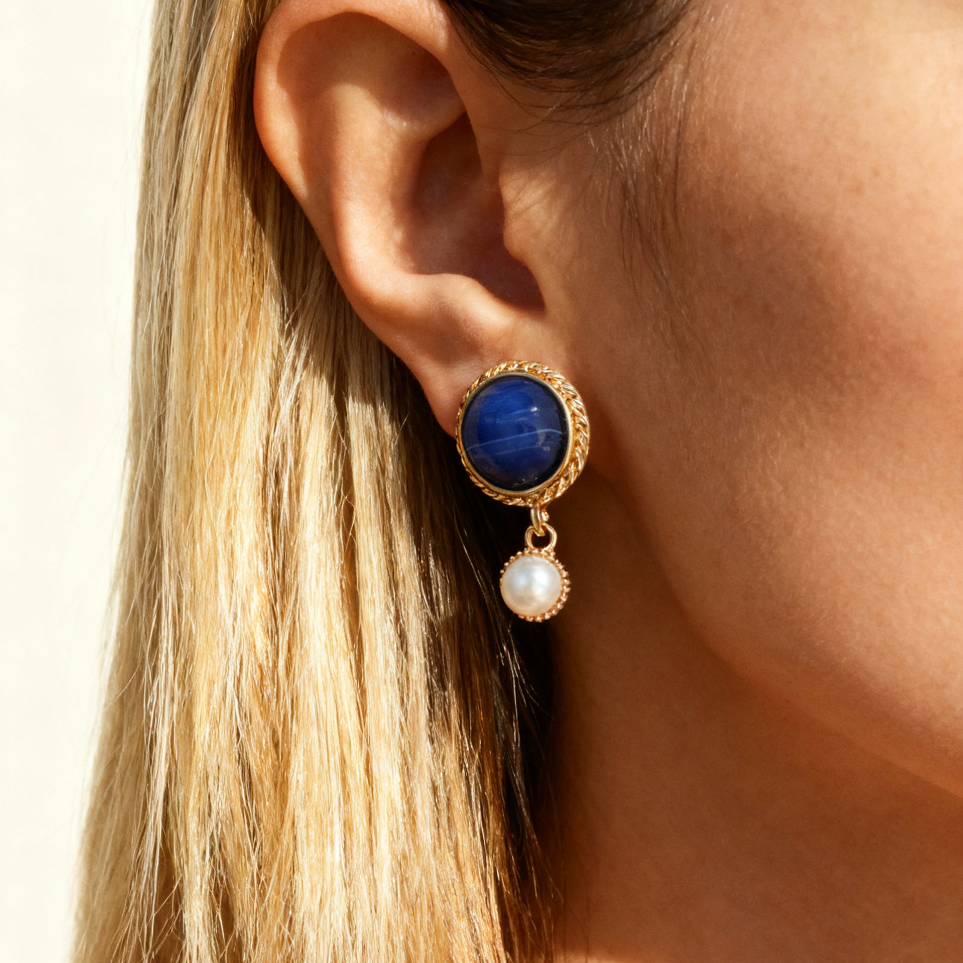 Classic with a vintage twist, these navy and pearl clip-on earrings feature a deep navy domed cabochon set in a gold rope-style frame, finished with a delicate faux pearl drop. The secure screw-back clip ensures a comfortable, adjustable fit for non-pierced ears. Timeless and versatile – perfect for weddings, dinners, or everyday elegance.