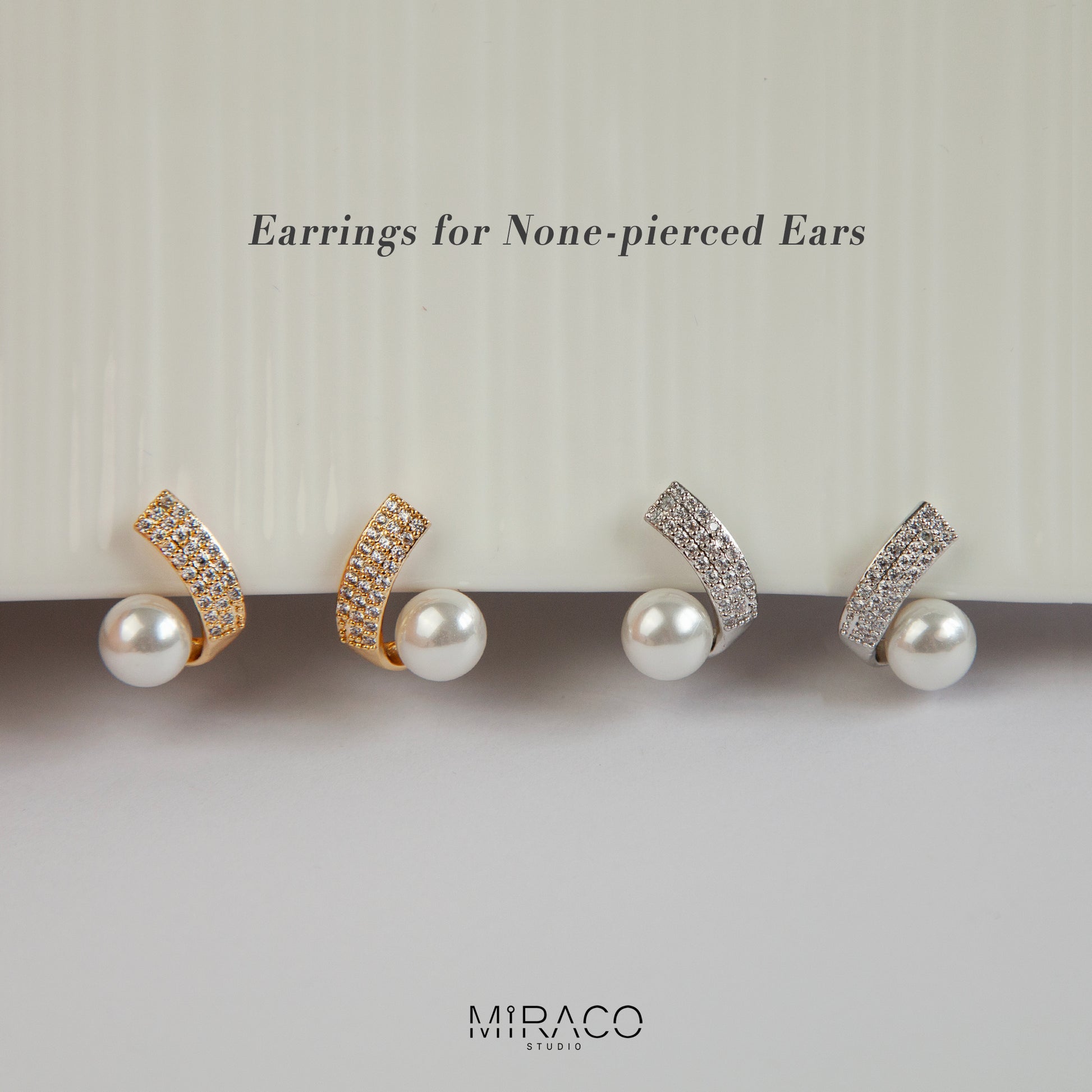 Pearls CZ Stud Clip On Earrings, Silver or Gold Ear Wrap Stud None Pierced Earrings