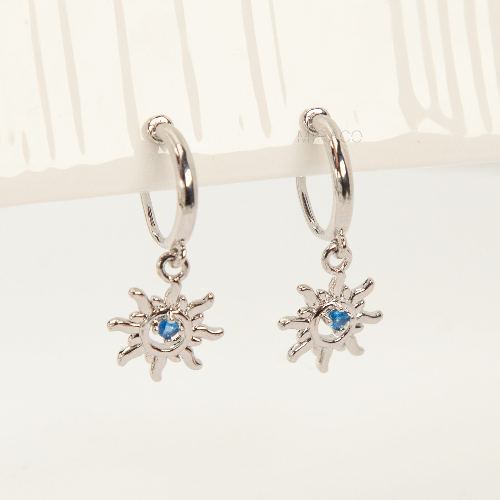 Shine bright with these stunning coil-back clip-on earrings. Featuring a trendy sunburst charm with a sparkling light blue crystal center, these dangle hoops offer a comfortable, secure fit for non-pierced ears. Perfect for adding a touch of celestial charm to any outfit. Easy to wear, stylish, and comfortable enough for all-day wear.
